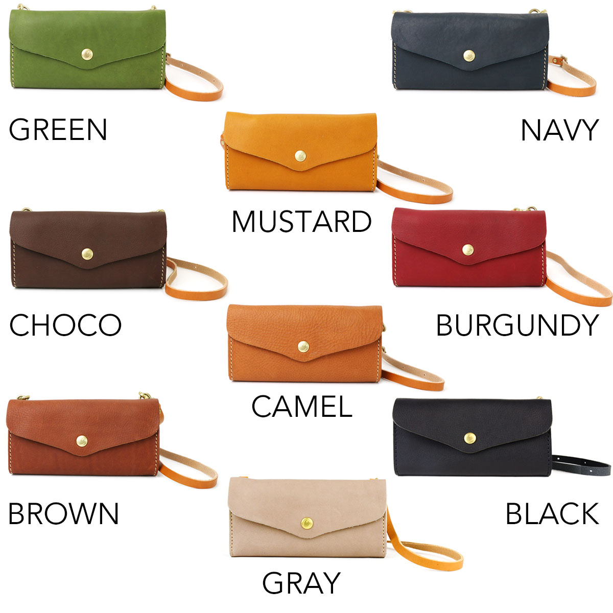 お財布ポシェット ポーチウォレット CHAM チャム 姫路レザー 栃木レザー レディース 横長 2Way クラッチバッグ ミニショルダーバッグ 本革 日本製 牛革 女性用 婦人用 メイドインジャパン 送料無料 あす楽対応可能 緑 グリーン ネイビー マスタード グレー ブラウン キャメル
