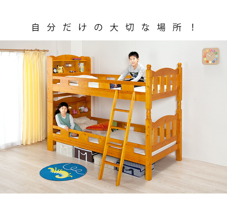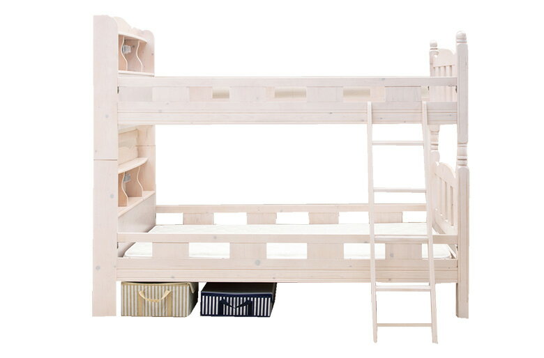 【サイズ】 本体外寸:幅103 奥行き217 高さ177cm ベット内寸:幅98 奥行き199cm 【材質】 パイン無垢材 【カラー】 ホワイト/ライトブラウン ※宮付・ライト付2段ベット 振動に強い安心設計 7cm角のしっかりとした太さの柱 柱連結部は金ダボでしっかり固定。