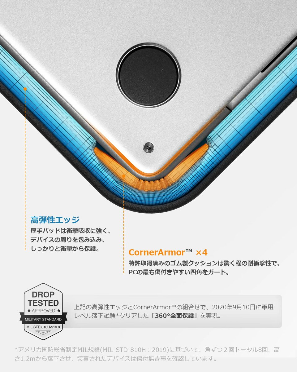 商品説明【軍用規格の360°全面保護】四角にある特許取得のゴム製「CornerArmor」クッションとPCをフル周る厚手の高弾性エッジの組合せは、エアバッグのように超強耐衝撃力でパソコンを衝撃や意外の落下から守り、2020年9月10日に軍用落下試験(規格MIL-STD-810H:2019)をクリアしました。