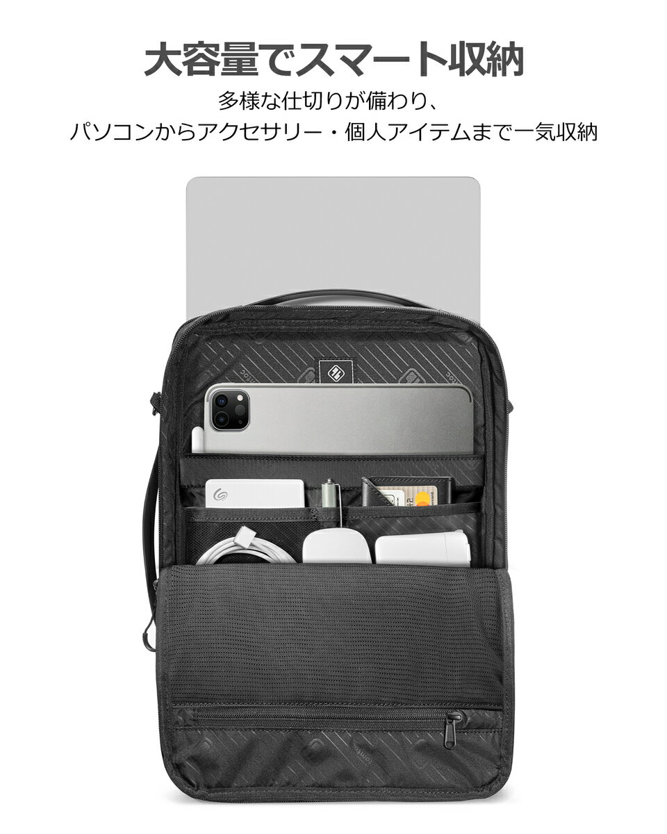 スマートな収納ノートPC用コンパートメント、特許出願中のフロントポケットはiPad、ペン、充電器、モバイルバッテリ、マウスと他のビジネスに必要なアイテムを仕分けてまるごとに収納可能。