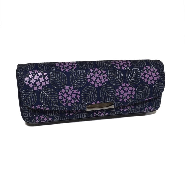 紺地の鹿革にグレーの漆で葉と小花を描き、紫陽花を象徴する四ひらの花を紫の更紗で色付けしました。