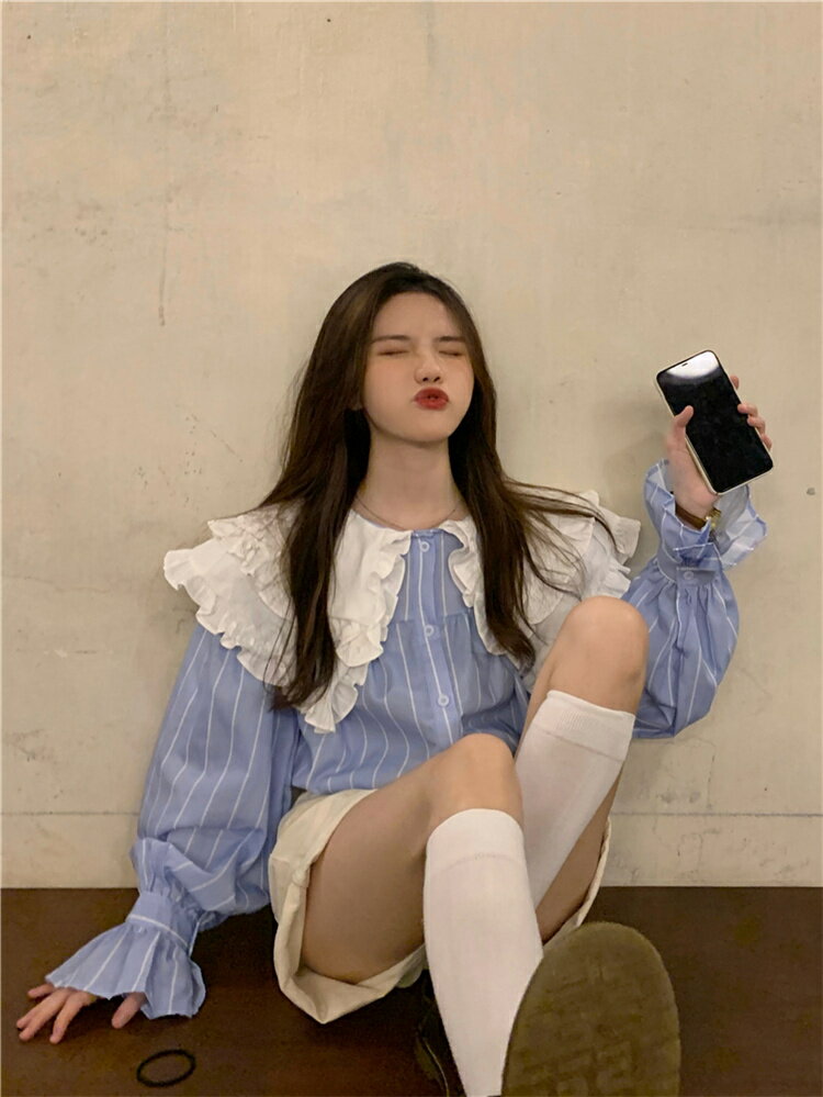 韓国ファッション ゆったり 可愛い 辺 人形の襟 ランタンスリーブ シャツ(T)