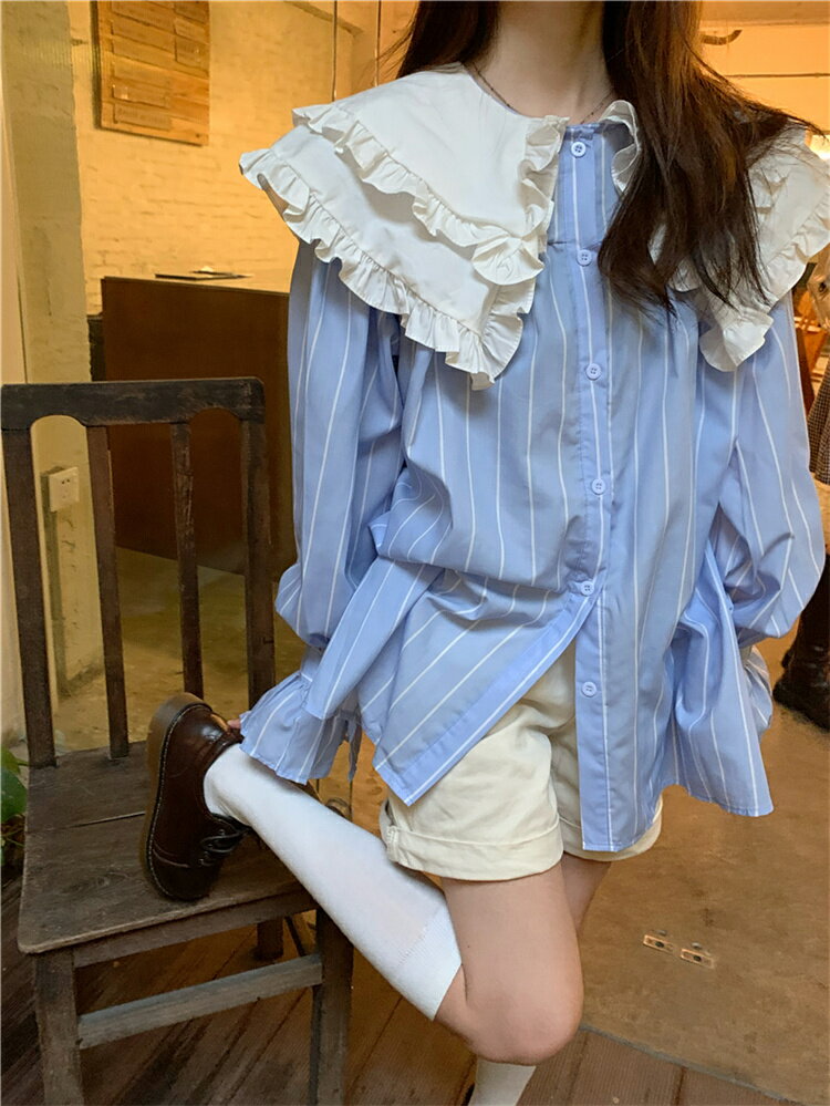 韓国ファッション ゆったり 体型カバー 可愛い 辺 ドーリー 大きい襟 ランタンスリーブ シャツ【素材】ポリエステル コットン【カラー】画像の色サイズ:着丈:約56cm 袖丈:約59cm 肩幅:約38cm バスト:約98cm ※サイズについては2-3センチの誤差があります。