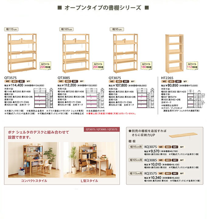 ■商品仕様 カラー ME/ピュアオーク MH/モルトブラウン MK/モカブラウン MY/シアーホワイト サイズ(cm) 幅89.9×奥行26×厚さ3 仕様 主材:オーク 可動式ブックエンド金具付(1個) ※書棚 QT30 / QT35 の専用オプションです。