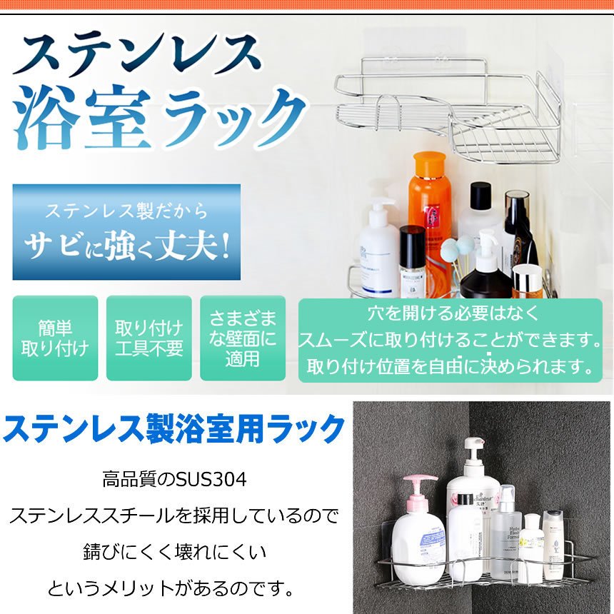 浴室ラック ステンレス お風呂 ラック シャンプーラック コーナー 強力粘着テープ固定 浴室 台所 収納 インテリア tec-shamrack