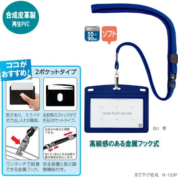 商品名 吊り下げ名札 レザー調 品番 N-123P-BK 黒/ N-123P-BU 青/ N-123P-GN/ N-123P-RD 赤 /N-123P-YE 黄/N-123P-SBU(空) サイズ ケース外寸:縦80×横103mm/内寸:縦55×横90mm(名刺サイズ) ひもの長さ:約90cm、 仕様 ワンタッチで脱着できる金属フック 裏面名刺やカードを入れられる窓付き2ポケット 安全装置、長さ調節機能付 材質 ケース-再生PVC(合成皮革)、紐-再生PET、フック-金属 メーカー オープン工業 ※他のモール及び店頭売りと在庫を併用しておりますのでご注文後でも在庫切れの場合がございますのであらかじめご了承下さい。