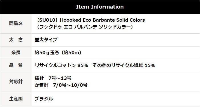 【SU010】Hoooked Eco Barbante Solid Colors(フックドゥ エコ バルバンテ ソリッドカラー) ≪単色カラー≫ サイズ・模様編みによる使用量の変化はこちらをご確認くださいませ。